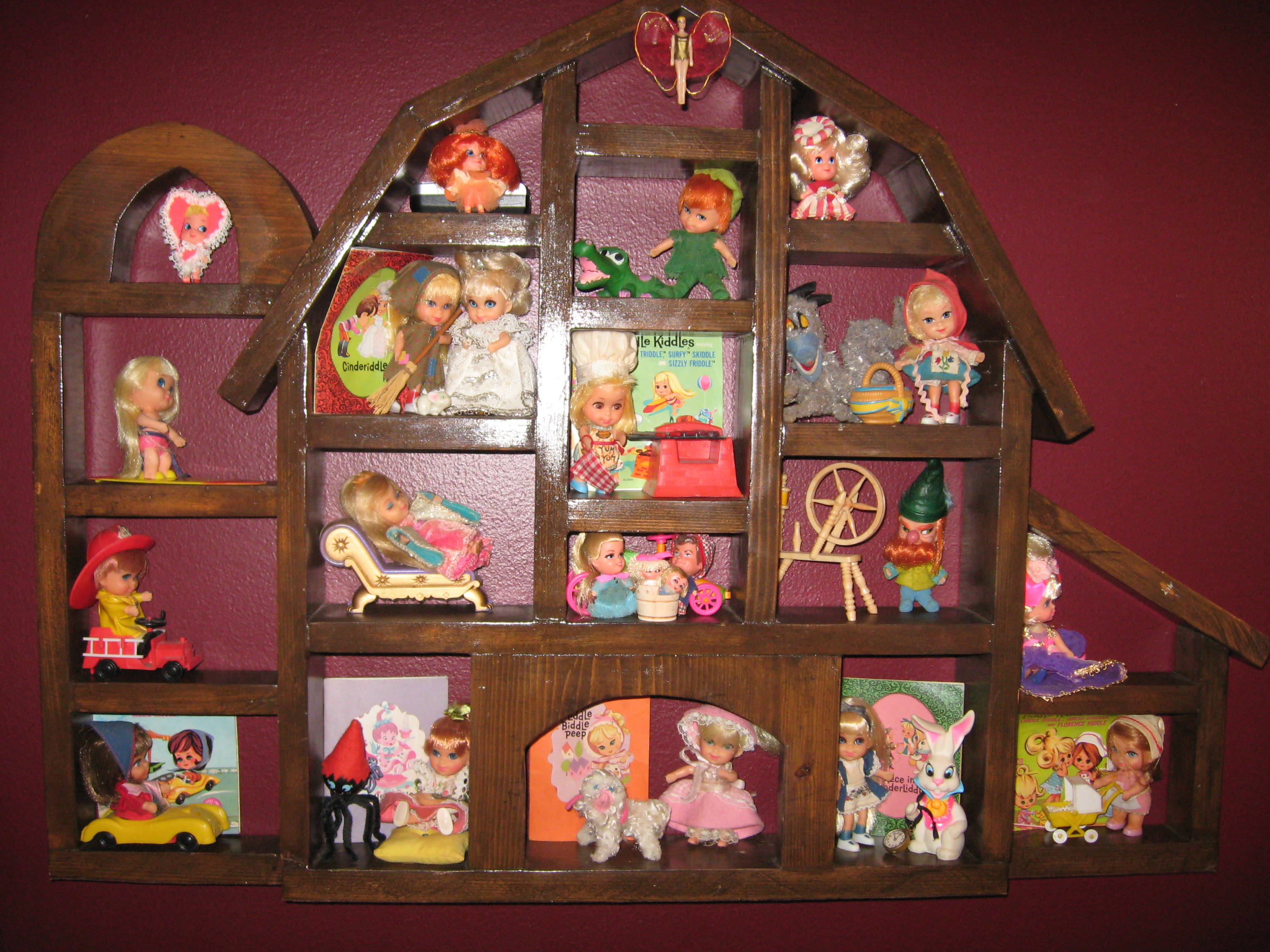 Every time I look at them, I’m reminded of wonderful times with my friends. Playing, collecting, and eventually talking them out of theirs! For a while I had my dolls displayed on a “Kiddle Land” that I made out of a piece of 6×6 plywood. I covered it in fake grass and rock pathways. It had a paper mache mountain, a beautiful castle made out of rocks that I pasted onto a cardboard box, a lake complete with plastic ducks, and multiple fake trees. It was pretty cool! But eventually, dust overcame it, and I had to disassemble it. Now I have some of my favorites displayed in a wooden frame on my wall.