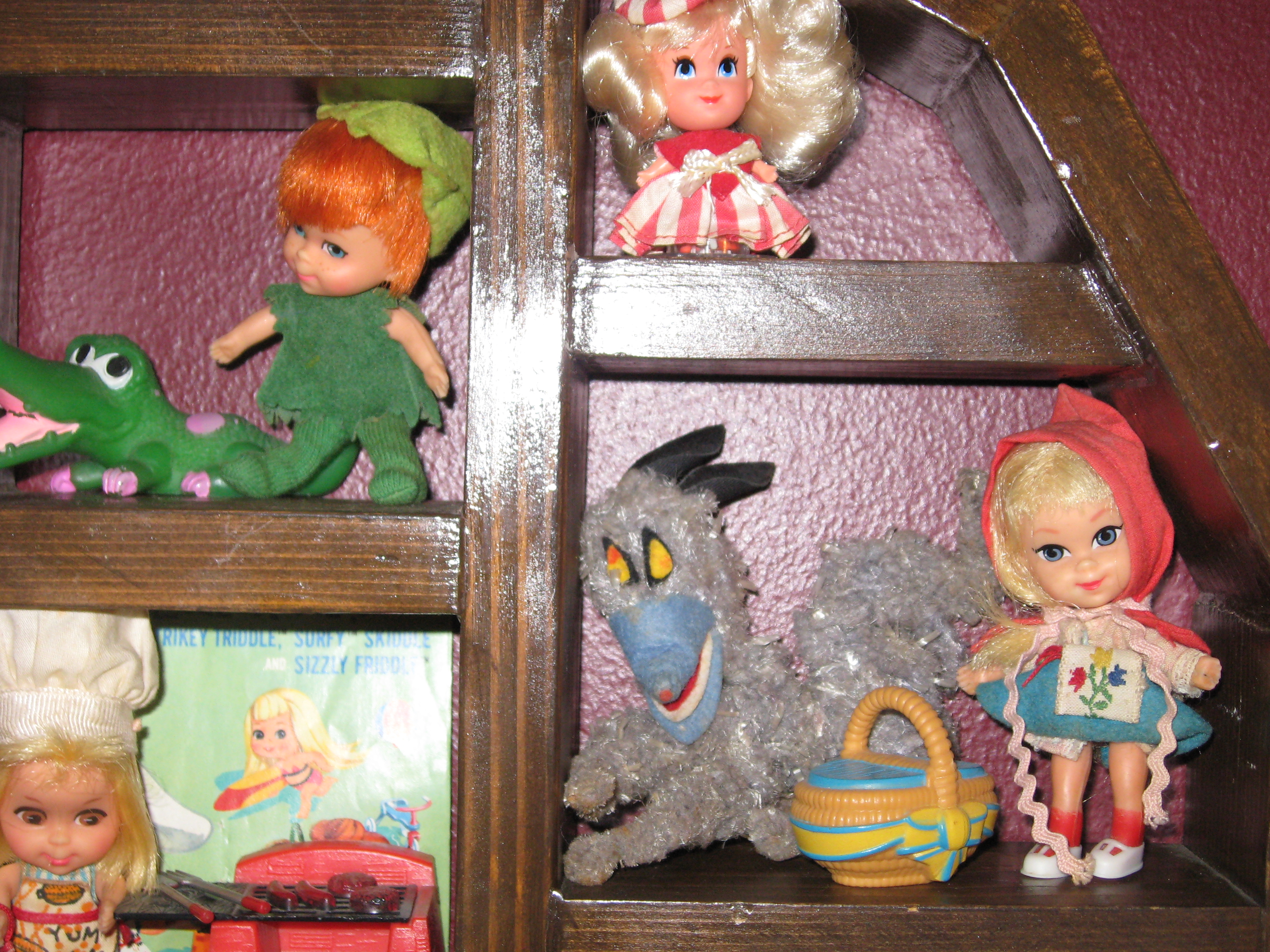 When I was in the first grade I was given my first Liddle Kiddle doll. Liddle Riddle Riding Hood. And believe it or not, all these years later she’s still wearing her original removable plastic shoes. And these things are tiny! The doll herself is only 3 1/2″ tall. She came with a bendable wolf. A fluffy little guy with wires inside.