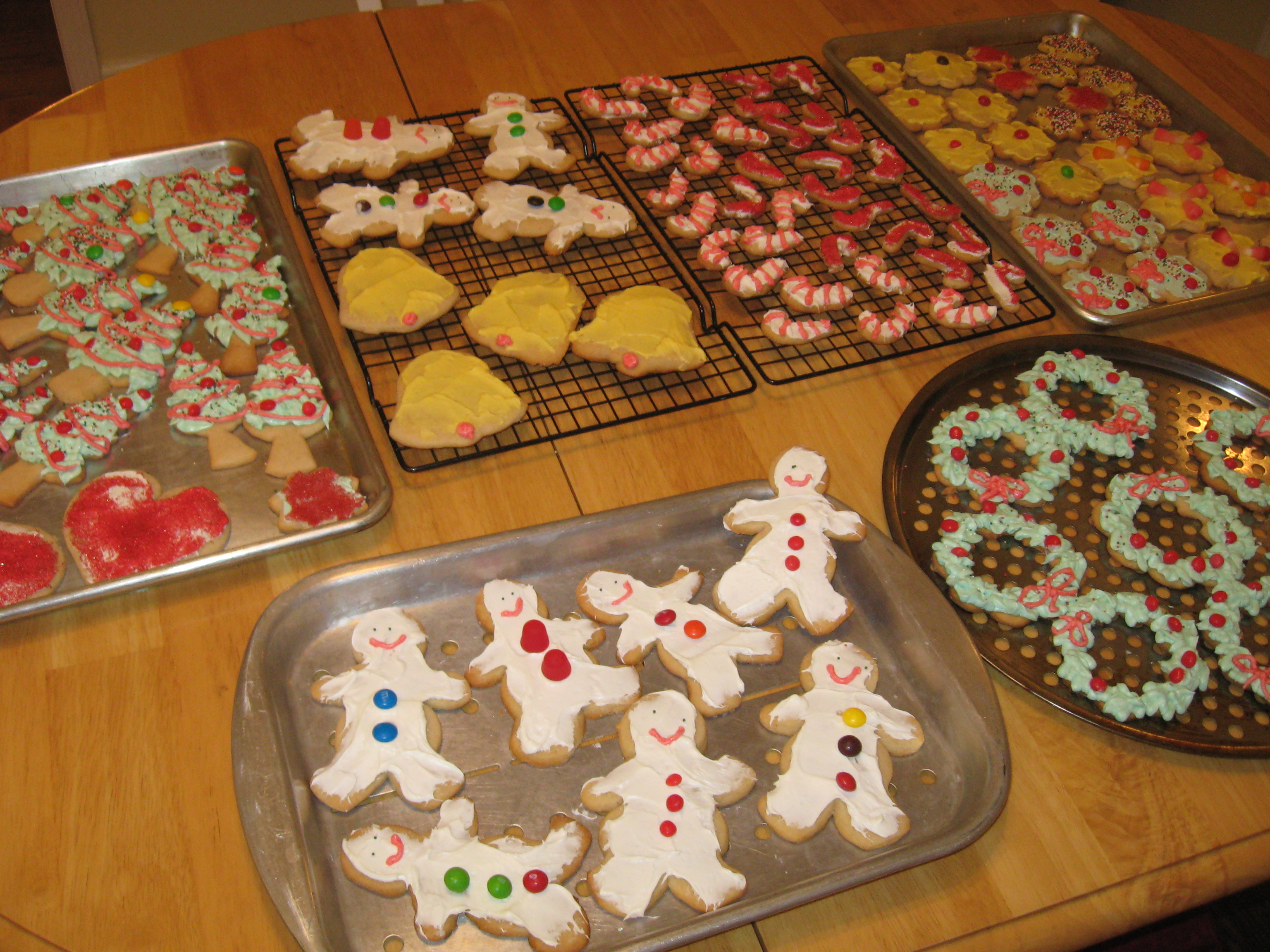 Roll the dough very thin and cut with cookie cutters. Place on greased baking sheet and bake at 400 degrees for 5-8 minutes. Then the real fun begins! Here’s a photo of my decorated masterpieces! ENJOY!