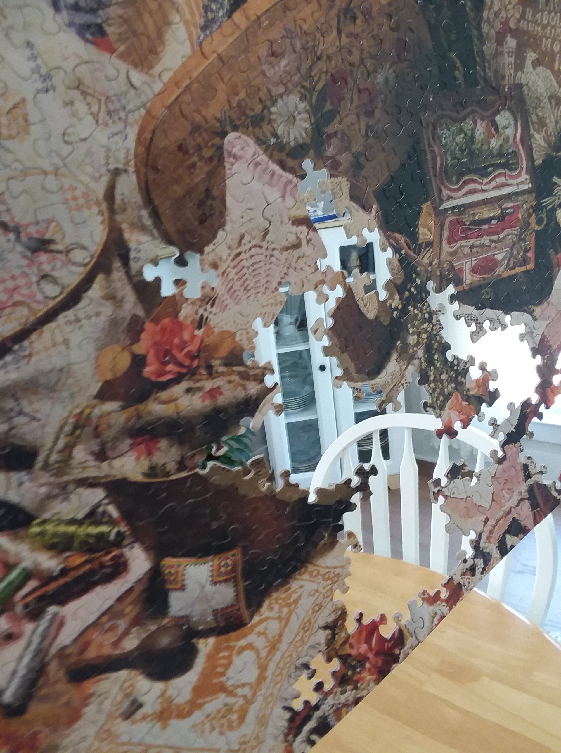 I recently put together the most tight-fitting puzzle I’ve ever encountered. So tight that I could hold it up in the air while it still had a lot of pieces missing. Hopefully, you can see what I mean in this photo.