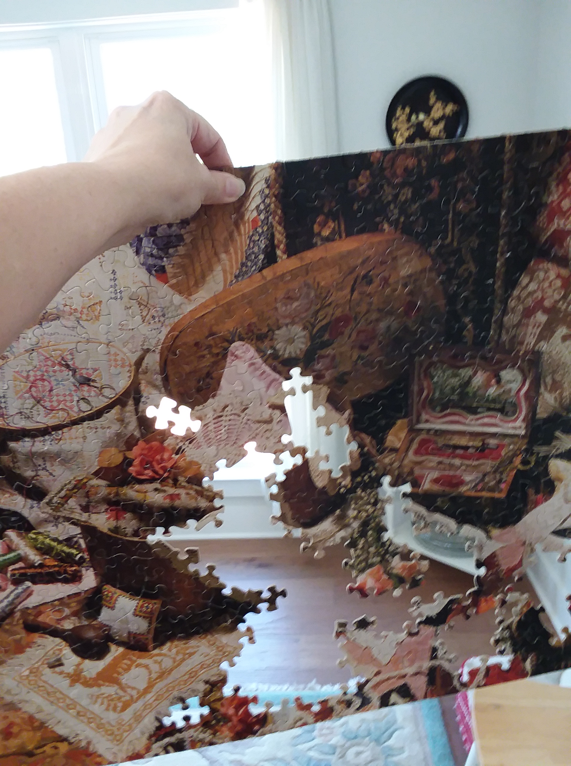 So what is it about jigsaw puzzles that draws me in? Maybe it’s because I like to fix things, and if I see something all discombobulated, I want to make it right. Plus, it’s so much fun watching an image come together. I don’t know about you, but I get a happy thrill every time I put a piece in place. I guess it’s good that it doesn’t take much to amuse me!