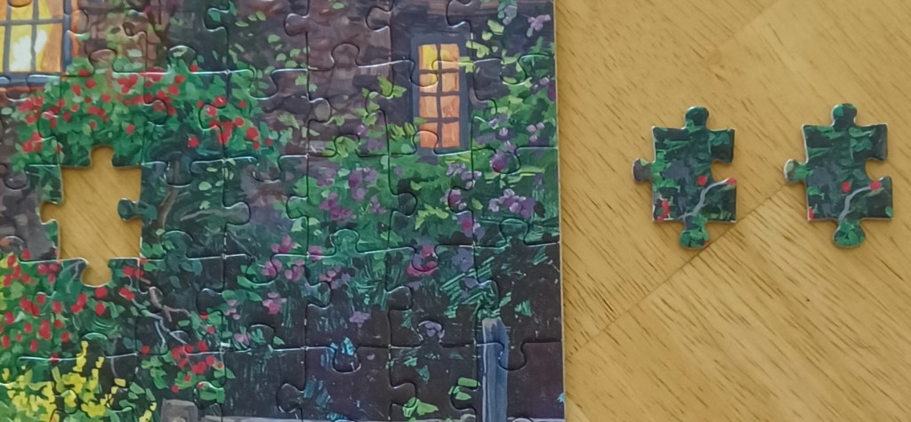 I’ve been gifted quite a few puzzles (thank you, Julie–my sister, and several other friends), and I’ve purchased many more. Some puzzles I buy new, however, I love finding them at antique malls, yard sales, and Goodwill. Of course, when I purchase an already opened box, I resign myself to the fact that pieces may be missing. Or better still, will likely be missing! Whenever I get down to the last few pieces in the box, I wonder…will I have them all?
