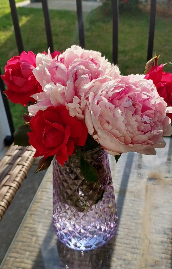 I was given a peony bush several years ago from a dear friend, and up until this year, it only had one bloom. I was able to enjoy more this year! I guess the bush has finally gotten ‘settled in.’ Joining it in this arrangement are some of my knock-out roses. They tend to do well every year.
