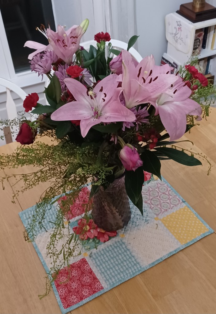 Last, but not least by any means, is a photo of a beautiful arrangement given to me by another friend as a thank-you for helping her out with her daughter’s wedding. I don’t feel I did much! I think I was more of a moral support than anything, but it was so sweet of her to gift me with these flowers.