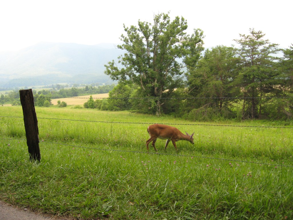 When we want to really enjoy nature, we like to go to Cades Cove in the Smokies. We try and make it an anniversary trip every year. We went earlier this month, and for the first time, it was raining when we visited the cove. We still saw a lot of wildlife–they didn’t seem to mind the rain–but we kept our windows rolled up to keep from getting wet! Here’s a photo from a previous trip when it wasn’t raining and we had our windows down.